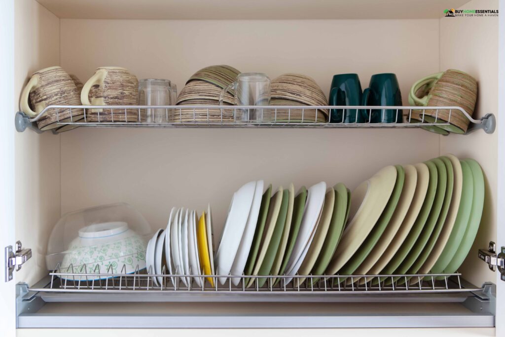 - Categorize dishes by type (plates, bowls, glasses, etc.). Arrange them in separate sections within the cabinet for easy access and neat storage.